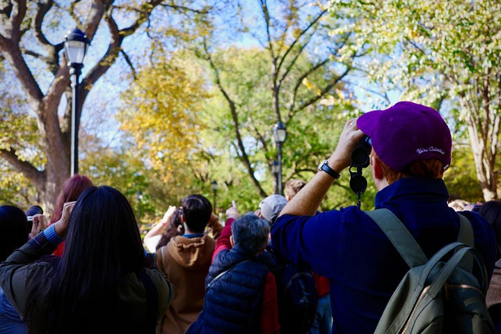 The park was crowded with sunbathers, musicians, food sellers, dog walkers, and young people drinking coffee behind sunglasses. Every bench was full. The people watching was phenomenal; we were looking for sparrows, woodpeckers, and kinglets. In a previous newsletter, I mentioned the slight embarrassment of being a city birder. Here I felt none of that. Most in the group had never gone birding or gone once or twice; they came across my event on Book Club Bar’s calendar and thought it sounded fun. Most were my age or younger. I think people are yearning to get off the internet and connect with others. Birding offers that chance, and it makes me happy to think that Bird City can serve as a guide for their curiosity.
